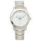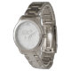 Diese Armbanduhr in silberfarbenem Stainless-Stahl hat ein weißes Gesicht mit nummerischen Silver-Gray Zeitmarkierungen, eine silbergraue extravagante Schriftrollkrone um 12.00 Uhr, Ihre drei personalisierten Monogramme und eine benutzerdefinierte Textzeile für Ihren Titel, Ihr spezielles Datum usw. Hat zweite Hand. Wählen Sie Ihre Lieblingsuhr, etc. Passen Sie dieses Element an.