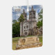 Eine farbenfrohe Fotografie der Eingangssignatur der Mission Concepcion mit der majestätischen Architektur der Kirche aus dem 18. Jahrhundert. Zwei viereckige Ornamente mit verschiedenen Fotos auf jeder Seite. Stellen Sie das Jahr nach Bedarf ein.