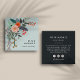 Lighthearted floral business cards in a unique square format feature a boho style bouquet in shades of coral and green, accented with a feather and greenery. Add your name and business name or title/occupation in the lower right corner, against a pale misty iced aqua background. Cards reverse to white lettering on a contrasting dark off-black background. Includes three social media icons in white, and a field for your username.