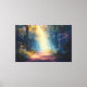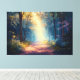 Dieses Bild zeigt einen mystischen Waldweg, der im sanften Morgengrauen gebadet wird. Das Sonnenlicht wird durch das dichte Dach gefiltert, wobei goldene Balken auf den Weg gegossen werden, der von üppigem Grün, Gelb und lila umgeben ist. Ein leichter Nebel bleibt in der Luft und verleiht der Szene eine verträumte, ätherische Qualität. Das Zusammenspiel von Licht und Schatten schafft ein Gefühl von Staunen und Ruhe und lädt den Betrachter dazu ein, in dieses bezaubernde Waldgebiet zurückzukehren.