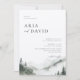 Elégante aquarelle misty forêt de pins de montagne, faire-part de mariage. Modèle de style design de typographie moderne et simple avec détails modèle sur le dos.