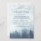 Dieses Hochzeitsessen-Probe-Dinner bietet ein rustikales und dennoch elegantes Design mit laky Script-Kalligraphie auf einem Aquarell von blauen Pinienbäumen in Nebel oder Nebel. Die Farben sind in verschiedenen Farbtönen aus grün, weiß und blassem Gold gehalten, was diese Einladung perfekt für eine Feier im Freien, in der Wildnis oder im Hinterwald macht.