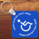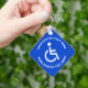 Der quadratische Schlüsselanhänger ist mit einem mit Behinderung, weißen Zeichen auf blauem Hintergrund und einem weißen, kreisförmigen Text versehen.