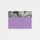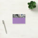 Das Bild auf der Post-Itanmerkung besteht aus rosa-lila Winden-Wildblumen auf der Rebe mit Schatten auf einem grauen hölzernen Zaun. Im Hintergrund ist die teilweise Ansicht eines Hauses und des blauen Himmels. Die Erholung des Post-It ist eine ergänzende feste lila Farbe.
