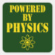 Powered by Physics - Gelbe Schablonenschrift und Atomgrafik auf dunkelgrünem Hintergrund.