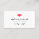 Ermuntern Sie Kunden, sich mit diesen schicken Referenzkarten in Schwarz und Weiß mit einem Pop kräftigen Mohns zu bedienen. Perfekt für Beauty-Boutiquen, unabhängige Berater und Lippenfarben-Distributoren, unser modernes und einfaches Design verfügt über eine Aquarell-Lippenkiss-Illustration mit "Verweisen Sie einen Freund" und Ihr Referral-Deal auf der Vorderseite (gezeigt mit "Sie erhalten beide 20% Rabatt"). Personalisieren Sie die Rückseite mit Ihren Referenzbedingungen, Geschäftsnamen, Standort und Kontaktinformationen. Enthält Platz für die Namen des Referrers und des neuen Kunden.