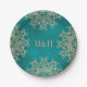 Ein schönes aquamarines bläuliches Grün und eine Goldhued mit Monogramm Papierplatte mit einem exotischen indischen inspirierten dekorativen Sarimedaillon wie Muster mit einem Blumen- und Lotosentwurf. Diese Papierplatte der eleganten und schönen modernen indischen Art ist für eine Hochzeit, ein Verlobungs-Party, ein Jahrestag celeberation, ein Probenabendessen, ein Brautparty oder eine Paardusche mit einem ethnischen indonesischen asiatische oder marokkanische oder arabische Nachtostthema perfekt. Sie kann mit dem Monogramm und den Initialen der Braut und des Bräutigams personalisiert sein, zum zu sein. Grafik © Chrissy H. Studios, LLC. Alle Rechte vorbehalten.