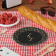 Cette plaque en papier Mariage noir et or monogrammé très design est conçue pour coordonner avec la Great Gatsby Mariage Collection. © Julie McIver