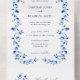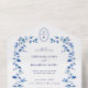 Elegante Aquarell-Blume und Rebsorten Blau und Weiß Delft in einer Hochzeitseinladung mit Paarinitialen.