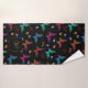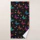 Monogramm Handtuch Set. Konstruiert mit einem eleganten Muster mit einer grafischen Abbildung von flatternden Schmetterlingen in vielen hellen Farben, die sehr schön auf dem schwarzen Hintergrund kontrastieren. Whimsikale Blumen, Zierspieße und Blätter verleihen dem Raum einen gewissen Charme. Ein schwarzer Rahmen mit einem goldfarbenen Rahmen überlagert mit einem personalisierten Monogramm-Initial im Inneren.