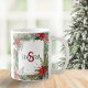 Bleibe gemütlich und genieße deine heißen Drinks mit dieser dekorativen Weihnachtsweihnachtsfeier, personalisiert mit einem Namen und initial als elegantes Monogramm. Das Monogramm ist auf beiden Seiten der Tasse, umgeben von einer schönen Grenze von Wintergrün und roten poinsettia Blume. Auf der hübschen Tasse befindet sich auch ein fröhlicher Schneemann im Aquarellstil gegenüber der Griffseite der Tasse. Die Tasse mit festlichem und botanischem Charme ist ein ideales Geschenk und kleine Geschenk für Liebhaber von Tee, Kaffee oder heiße Schokolade.