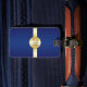 Gepäckmarke mit Monogramm. Sie können diese Taschenmarke mit jedem beliebigen Text Ihrer Wahl anpassen. Wenn Sie Hilfe bei der Anpassung benötigen, kontaktieren Sie uns über den Link auf dieser Seite. Mit Monogramm Gepäckmarke in Blau und Gold.