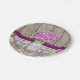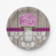 Hübsche rustikale Art mit Monogramm Mason Glas Papierplatte mit einer rötlichen lila Hydrangea-Blume und einem Holzzaun und antiken Damastmuster Spitzen-Hintergrund und geheftete Pflaumenfarbband. Diese Hochzeitsdusche oder Brautparty- oder Paardusche, Verlobung- oder Jubiläumsplatte personalisiert mit den Initialen und Monogramm des glücklichen Paares oder Braut und Bräutigam auf dem Maurerkrug ist perfekt für ein Land, Bauernhaus, Gartenhaus Party oder barnyard Stil besondere Anlass oder Feier. Designed by Chrissy H. Studios, LLC. Alle Rechte vorbehalten.