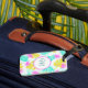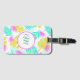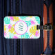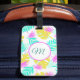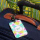Ein tropisches Gepäcksschild in Pastellfarben, Blau, Gelb und Rosa mit weißem Blätter.