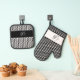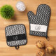 Das Oven-Mitt-Design zeichnet sich durch einen schwarzen Hintergrund mit weißen Polka-Punkten aus. Eine weiße Bar zeigt den ersten Eintrag in schwarz an. Potholder hat das gleiche Design in umgekehrten Farben. Erstellt ein niedliches Aussehen für jede Küche und fügt diese persönliche Touch hinzu.