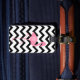 Ein Geschenk, das eine Illustration eines rosa Flamingos kennzeichnet. Personifizieren Sie mit Ihrem Monogramm innerhalb des Kreises auf dem Körper des Flamingos. Hintergrund ist Schwarzweiss-Zickzack.