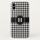 Mit Monogramm iPhone X Gehäuse mit einem farbenfrohen, schwarz-weiß kontrollierten Gingham Country Style Muster und einem weißen, anpassbaren Monogramm auf einem schwarzen Band. Machen Sie es sich selbst, indem Sie Ihr Monogramm in das Vorlagenfeld eingeben.