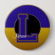 Mit Monogramm Knopf für Schulfarben, Blau und Gold, Letter L- Ein großer, rund 4 Zoll Button gedeckter Knopf mit einem gesteppten Monogramm-Buchstaben in der Mitte. Der Hintergrund dieses Knopfes wird in zwei Schulfarben (blau und gold) mit einem mittleren Loch-Ausschnitt erstellt, der einen schwarzen Hintergrund darunter zeigt. Der runde Rahmen wird in der Mitte und an den Außenkanten mit einem schönen goldenen Rand ausgetrimmt. In der Mitte befindet sich ein großer Alphabet Buchstaben, der in Goldnähe geschnitten ist. Es gibt bereits einen Textbereich, in dem Sie nach Belieben personalisieren können. Sie können einen Vornamen, Nachnamen, einen Schulnamen oder alles andere schreiben, was Ihnen gefällt. Sie können auch den Textbereich löschen, wenn Sie es vorziehen. Personalisieren Sie diese Schaltfläche Schulfarben auf Anzug. Diese Monografie-Schaltfläche des Kollegiums ist in verschiedenen Schulfarben erhältlich.