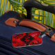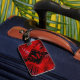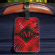 Tropisch rote Palmfronten auf schwarz zeichnen Ihr Monogramm in schicker Schrift auf der Vorderseite und einen Kartenschlitz auf der Rückseite aus, um die Erkennung zu erleichtern. Schaffen Sie sich selbst oder geben Sie als Geschenk.