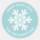 Ein schlichter, blauer und weißer Schneeflockenaufkleber mit dem Gruß, Made with Liebe. Personalisieren Sie es mit Ihrem Familiennamen. Spaß für die hausgemachten oder handgefertigten Weihnachtsnachbarn Leckereien und Geschenke. Entworfen für Sie von BlackBerry Boulevard.