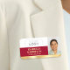 Erstellen Sie mit diesem personalisierten Identifikationsnamensschild ein berufliches Erscheinungsbild. Eine einfache und stilvolle Vorlage mit Ihrem Firmenlogo, Namen, Jobtitel und ID-Foto. Dieses vielseitige Design würde viele verschiedene Arbeitsplätze und Berufe Anzug haben, darunter Firmenfachleute, Einzelhändler, Schönheitsberater, Hotelmitarbeiter, kleine Unternehmen, Tagungsnamen und vieles mehr. Erhältlich mit traditionellem Button oder Magnetverschluss. Druckfarben aus Abzeichen: Rot und Weiß mit goldenem Farbverlauf.