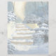 Schneebedeckte Treppe, umgeben von schneebedeckten Büschen.