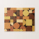 Dieses abstrakte Kunstmuster im Retro-Stil der 50er Jahre weist Quadrate, Kreise und Halbkreise in Orange-, Gelb- und Brauntönen auf.
