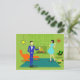 Diese moderne Postkarte aus dem Mittelalter sieht aus wie eine Szene aus einer romantischen Komödie. Das minimalistische Design der 60er Jahre besticht durch ein ansprechendes Cartoon-Paar, das einen romantischen Abend bei Zuhause genießt. Das elegante Zimmer besticht durch eine grüne Steinmauer und einen Kamin. Die Einrichtung der Zimmer umfasst einen orangefarbenen, mit einem Stuhl passenden Sitzbereich, eine rote Wanduhr, eine gelbe Sternexplosion, eine Lampe mit Sputnik und einen orangefarbenen Beistelltisch, der zu einem tragbaren, grünen Schallplattenspieler Zuhause. Auf dem Fußboden neben dem Endtisch sieht man eine Schallplatte aus einem kitschigen Albumcover. In der Mitte des grünen Fußbodens befindet sich ein großer, rechteckiger, aquamariner Teppich. Mitten in der Szene haben wir ein sehr raffiniertes Paar. Es gibt einen suave Mann in einem königsblauen Anzug, weißes Shirt und blaue Bogen Krawatte. Der große, dunkle und gut aussehende Mann blickt auf seinen hübschen Begleiter. Die elegante, ravenhaarige Frau trägt ein üppiges Aqua-Kleid. Sie besitzen jeweils ein Kristallmartini-Glas mit schwimmendem Olivenöl. Prost! Hier zum perfekten Abend bei Zuhause!