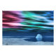 In der Bucht eines gefrorenen Landes schwimmt ein großer Eisberg im kalten blauen Meer. Schneeflocken und Sterne stören die Szene, und am Himmel leuchtet das Polarlicht in Rosa, Lavendel, Grün und Blau.