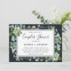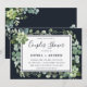 Die Duscheinladung für Paare umfasst ein gemaltes Aquarellbild, Eukalyptus und botanisch grüne Blätter mit einem Rechteck im marineblauen Hintergrund. Matching-Elemente sind ebenfalls verfügbar.