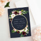 Ein elegantes Hochzeitsdesign, das Ihre Hochzeitsdetails in einem gerahmten Kreis mit goldfarbenen Blume und Blattwerk in Rot, Elfenbein, Bordeaux und Grün auf einem reichen dunkelblauen Hintergrund Save the Date.