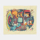 Blanket in einer skurrilen Illustration mit vier spielerischen Katzen, die Retro-Mediengeräte genießen. Eine Katze sitzt neben einem Vintagen Fernseher, während eine andere, die eine rote Brille trägt, auf Buchstapeln und Platten steht. Ein Turntable- und Kassettenspieler erinnert an eine Ästhetik aus der Mitte des Jahrhunderts.