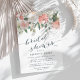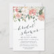 Elegante und moderne Blumendusche mit Blumenstrauß, ein Bouquet mit sanften pastellfarbenen Rose, Pfannkuchen und Hydrangeas in den Farbtönen Rosa, Pfirsich und Creme, mit üppig grünen botanischen Blätter und Eukalyptus. Personalisieren Sie Ihre Brautparty-Details in eleganter, rauchblauer Schrift mit handgeschriebener Kalligraphie.