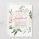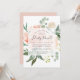 Elegante und moderne Blumen-Babydusche mit einem Bouquet von weichen pastellfarbenen Aquarellbeinen in Rosa, Pfirsich und Creme, üppig grüne botanische Blätter und Eukalyptus. Ihre Babyduschdetails überlagern sich auf einem weißen Element in eleganter, rauchblauer Schrift mit handgeschriebener Stilkalligraphie.