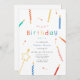 Geburtstagsfeier Einladung mit verschiedenen Formen und Farben von Kerzen mit Streichhölzern in der Mitte des Textes.