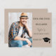 On front: Add your own vertical size photo of the graduate. A trendy mocha, beige colored background, black text. Templates for a name and date. The name is written with a modern hand lettered style script. With a cap, tassel topper.