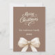 Mocha, brauner Hintergrund, cremefarbener Text und Bogen. Fröhliche Weihnachten wird mit einem eleganten, handgeschriebenen Stil geschrieben. Personalisieren Sie Ihren Familiennamen und fügen Sie ihn hinzu. Zurück: Fügen Sie Ihre Nachricht und Ihre Namen hinzu.