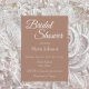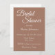 Einfache Stil, Brautduscheinladung mit mochafarbenem Hintergrund, Name und Veranstaltungsort der zukünftigen Braut, Kontaktaufnahme, etc., in weißer, stilisierter Schrift gedruckt. Personalisieren Sie Ihre Einladung, indem Sie Text durch eigene Brautparty-Informationen ersetzen. Wählen Sie Ihre Einladung Papier Stil und Quantität.