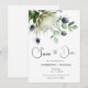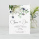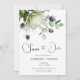 Cette belle carte de faire-part de date présente une peinture à l'aquarelle de protea et de fleurs de chardon avec des branches d'eucalyptus. Les couleurs sont douces et discrètes, donnant à la carte une élégance et une atmosphère romantique. Les mots « Sauvegarder la date » sont écrits dans une belle police script qui complète la peinture à l'aquarelle. Les noms du couple, la date et le lieu du mariage sont également inclus dans une police simple mais élégante