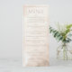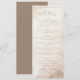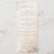 Ce menu de mariage élégant présente une mise en page orientée verticalement avec un fond aquarelle beige doux, créant une atmosphère rustique mais sophistiquée. Le design utilise une palette de tons terre assourdis et une typographie serif pour transmettre la formalité, avec des titres de section dans un brun légèrement plus foncé pour une hiérarchie visuelle. Chaque plat est listé clairement, avec des noms en italique ajoutant une touche d'élégance. Des espaces personnalisables permettent une personnalisation pour les noms et les dates, ce qui fait de ce modèle un choix parfait pour les événements formels. L'ambiance générale est discrète et raffinée, idéale pour les couples recherchant une esthétique classique et intemporelle.