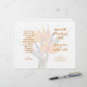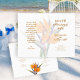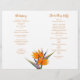 Programme de mariage plié modèle avec fleurs oranges oiseaux de paradis. Livre blanc de quatre pages à customiser en écriture et en texte orange imprimé. Inclure un message à la famille et aux amis sur la dernière page / arrière du programme lorsque plié.