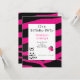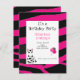 Une mignonne invitation d'anniversaire dans la jungle avec un petit zèbre de dessin animé. Une bordure de zèbre motif en rose et noir l'accent. Customisez avec toutes les informations de votre parti selon vos besoins.