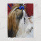 Chien shih-tzu blanc et brun avec un arc dans sa fourrure.