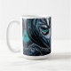 This striking coffee mug features a modern side-profile portrait rendered in shimmering deep teal, cyan, black and silver metallic tones. The stylized face seems sculpted from liquid metal, with smooth curves, sharp graphic lines and glossy highlights that catch the light like a futuristic mask. The cool teal accents add a mysterious glow, while the dark metallic shadows give the design depth and drama.