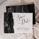 Diese elegante, moderne Save the Date-Karte verfügt über einen schwarzen Aquarellstreifen in Aquarellfarbe, der mit Imitaten silbernen Glitzer bestickt ist. Der anpassbare Text kombiniert handgeschriebene Skripte, Copperplate und kursiv Schriftart in Holzkohlegrau auf weißem Hintergrund. Auf der Rückseite ist ein passendes schwarz-silberfarbenes Design erkennbar.