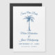 Frag deinen Gästen, ihr Hochzeitsdatum mit diesem schlicht eleganten Design retten, das moderne Schrift, blauen Text und eine künstlerische Palme beherbergt. Passen Sie es mit Ihrem Hochzeitsdatum, Namen und Ort an.