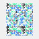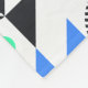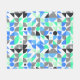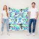 Diese moderne Fleecedecke weist ein farbenfrohes, geometrisches Muster mit Linien und Formen in Schwarz, Blau und Grün auf weißem Hintergrund auf.