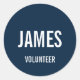Modern Blue Volunteer Name Classic Round Sticker Autocollant volontaire moderne avec un nom personnalisé. Parfait pour l'équipage, le personnel, le stagiaire, les groupes et les événements.