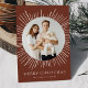 Stilvolle und moderne Urlaubskarte mit Ihrem Foto, eingebettet in einen runden weißen Sonnenburstrahmen. Personalisieren Sie die Weihnachtskarte mit Ihrem Familiennamen in weißer Schrift auf einem Zimtbraun oder einer Farbe Ihrer Wahl. Auf der Kartenrückseite werden das Jahr und ein zusätzliches Foto angezeigt.