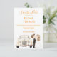 This elegant save-the-date wedding invitation features a timeless design centered around a beautifully illustrated antique wedding car, evoking a sense of vintage romance and charm. Beside it, a bride and groom share a tender kiss, capturing the joy and intimacy of the special moment. The text is presented in a rich marigold hue, adding warmth and sophistication while standing out gracefully against the background. Thoughtfully designed to be fully customisable, every detail—from names and dates—can be tailored to reflect your unique celebration.